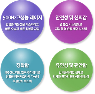 또한 5차원 안구 추적장치로 인하여 수축을 중심으로 이루어지는 안구의 회전에 따라 위치변화를 추적, 보정하는 기능과 레이저 조사의 중심점을 놓치지 않고 유지할 수 있습니다. 또한 동공을 자동으로 감지하여 더욱 더 안전한 수술이 가능합니다.